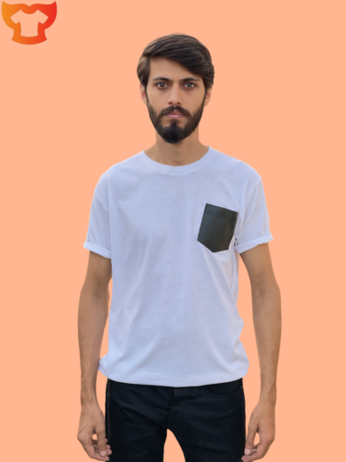 Black PREMIUM Leather Pocket WHITE T-Shirt